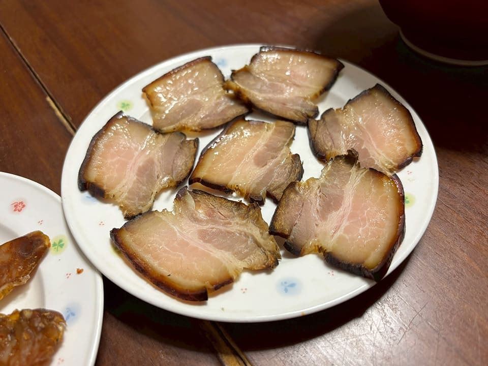 香腸は中国式ソーセージで、広東式の甘めの味付けとは異なり、キリッとした辛さが特徴でチョリソーのような立ち位置でしょうか。辛さで味が引き締まりお酒のつまみにもぴったり。腊肉は塩漬け肉を燻製にしたもので脂がジューシー、特に皮がカリカリと硬めなのが特徴です。四川ではこの硬めな皮が好まれるそうです。