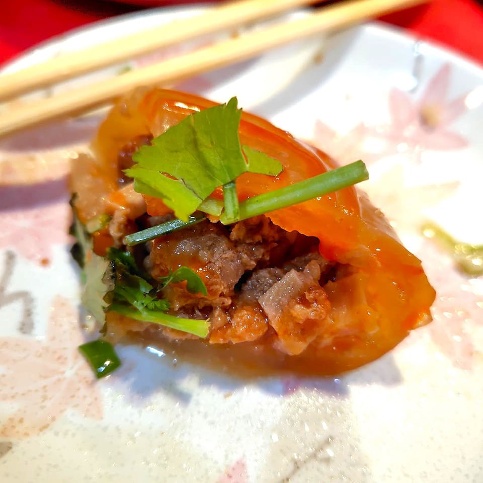 甘辛のたれがかかった厚いでん粉ゼリーの中に、小さい豚の角切り。現地で食べた時はあまり好きではなかったのですが、これは癖がなくて食べやすいです、と伝えると「タレを独自で食べやすく工夫をしているから」と嬉しそうな康宗さん。パクチーと一緒に食べると味にしまりが出ます。