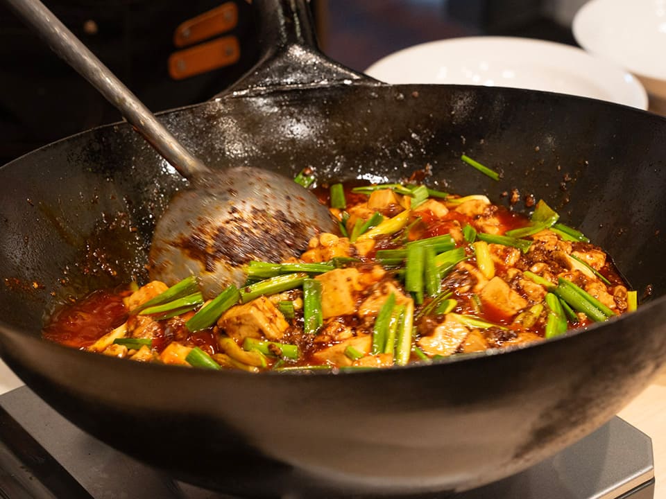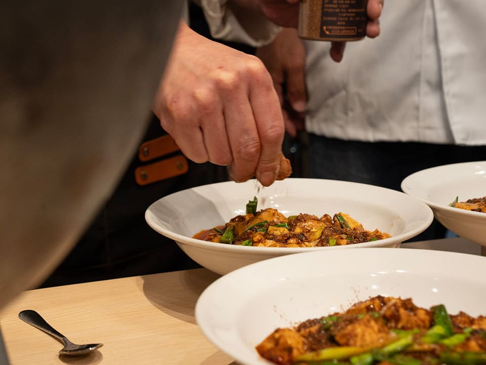 麻婆豆腐といえば”豆腐”。豆腐は事前に塩を入れて煮込むことで弾力が生まれるそう。また手でほぐして入れることで、表面積が増えて味が染み込みやすくなるのだとか。豆腐は味がなく、味も入りにくいため、山椒、唐辛子等の存在感の強い調味料をしっかり使うのがポイントだそう。