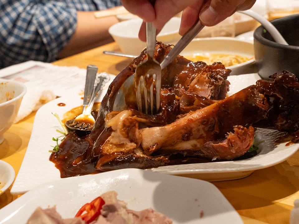 運ばれてきた際のインパクトに驚き、ナイフを入れるとホロホロに崩れて2度驚き。上海系の醤油と砂糖をベースにした甘辛い味付けで肉の脂とよくマッチしていました。