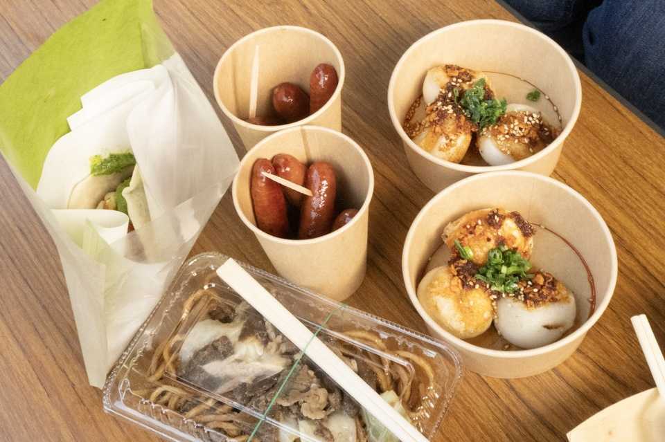 左から羊肉タコス、羊肉ソーセージ、ローメン、焼羊籠包です!