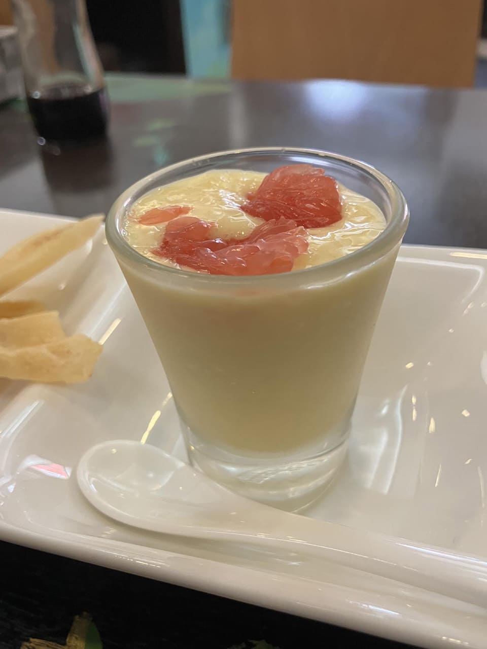 粥は味があっさり目で、薬味にニラの醤油漬けほかアクセントの付く味を3種類付いていて味変ができるようになっています。細切り海苔やナッツも入れられていて、ザクザクした食感を楽しめました。