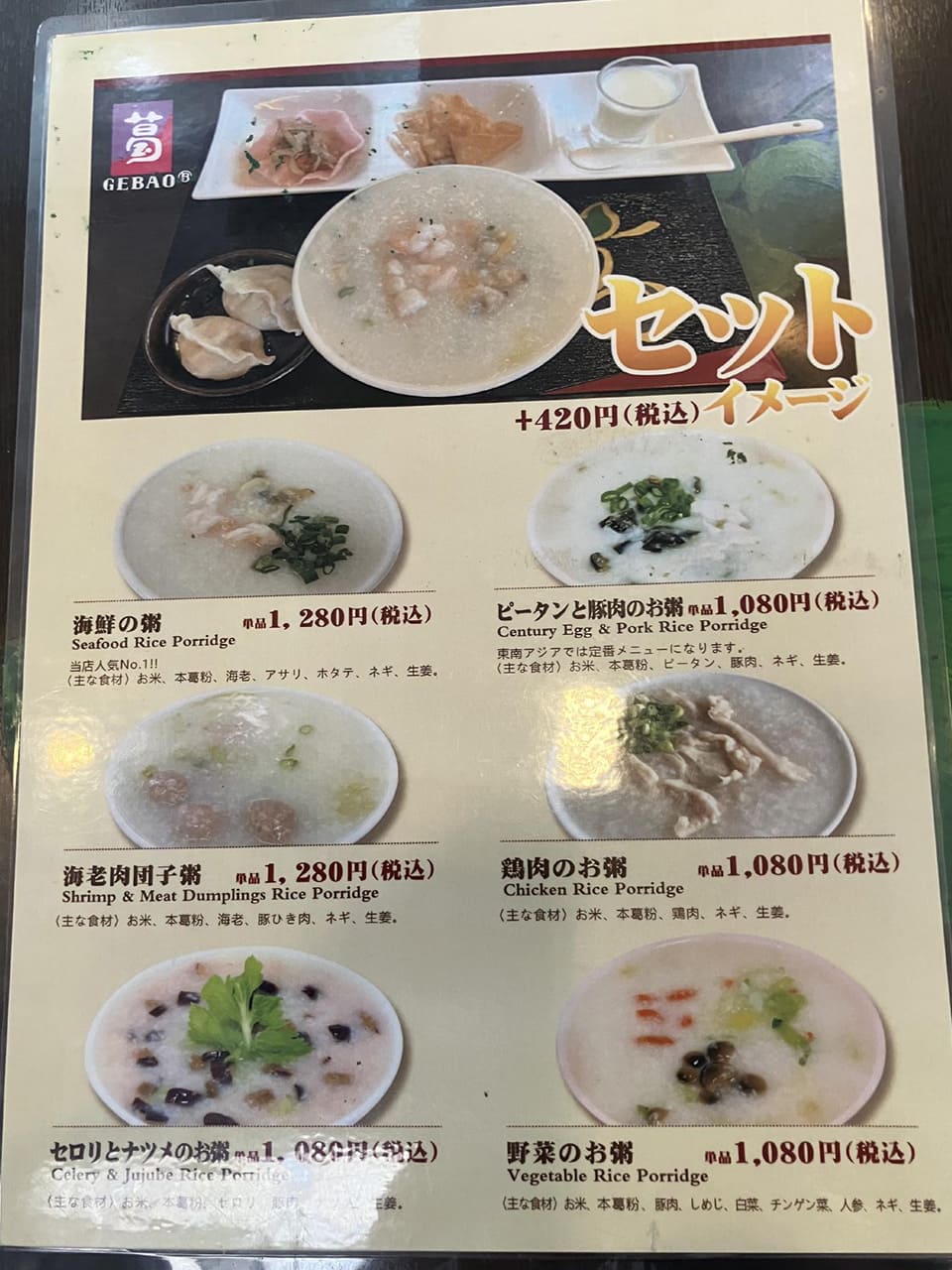 中華粥は4種類あり、お粥とおばんざいを自由に組み合わせるシステムです。今回は中華とり粥と大根もち1350円を注文しました。